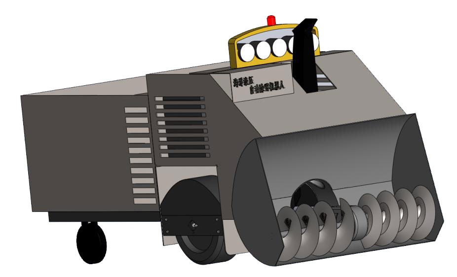 2. 该机器人主动力采用15 马力汽油机带动扫雪、抛雪机构、行车采用两个伺服电机驱动,后轮为万向随动机构,可原地360°转弯,行驶速度可无极调速、操控者通过无线遥控在家就能轻松完成冬季除雪、撒融雪剂,夏秋季落叶的收集、清扫工作。