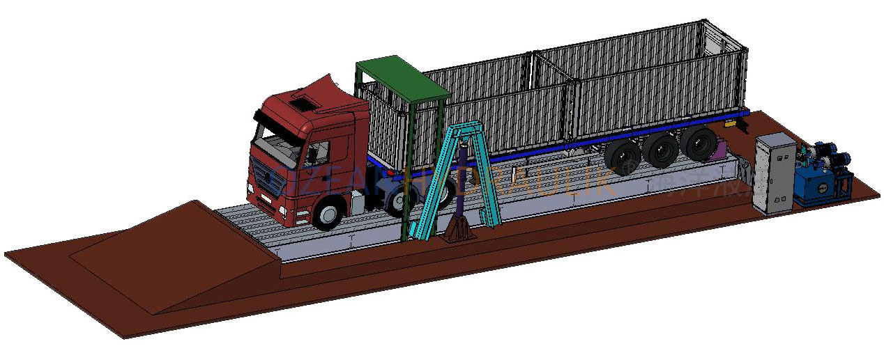 1. 汽车物料卸车平台设备,主要适用于大型半挂车拉用石料、矿粉、焦炭等散料的自动卸车、当汽车进入平台时,从平台底部会自动升起与汽车轮胎尺寸相同的挡板将汽车挡住,液压缸把平台缓缓顶起,直至车内物料倾倒在料仓内。整个动作平稳、安全、快捷。
